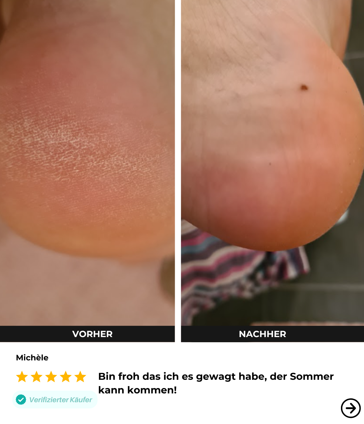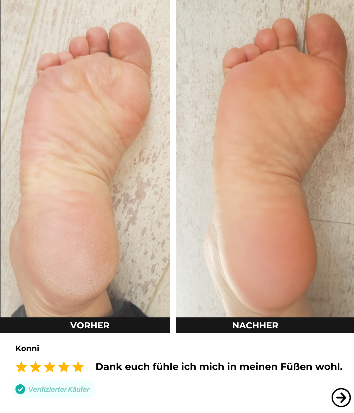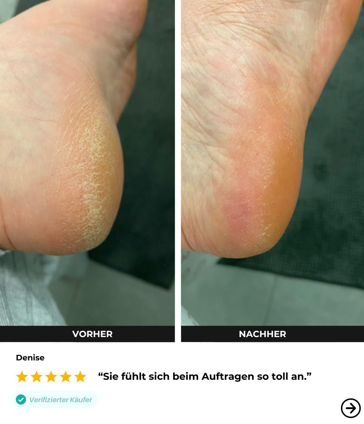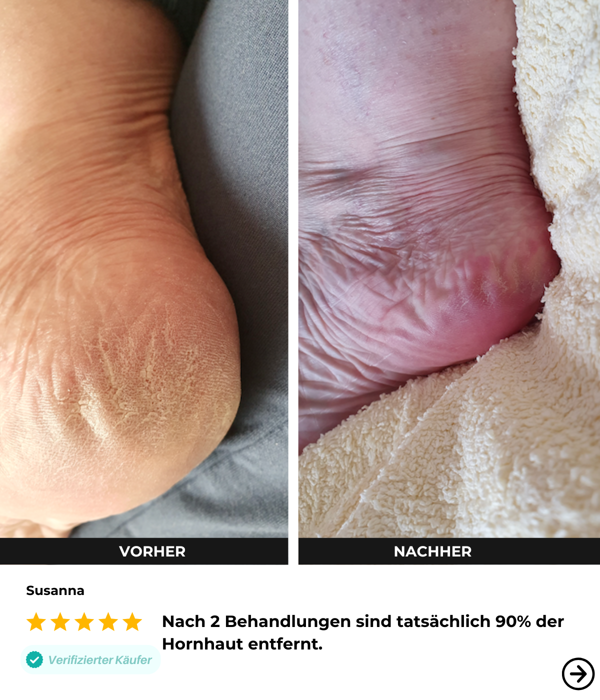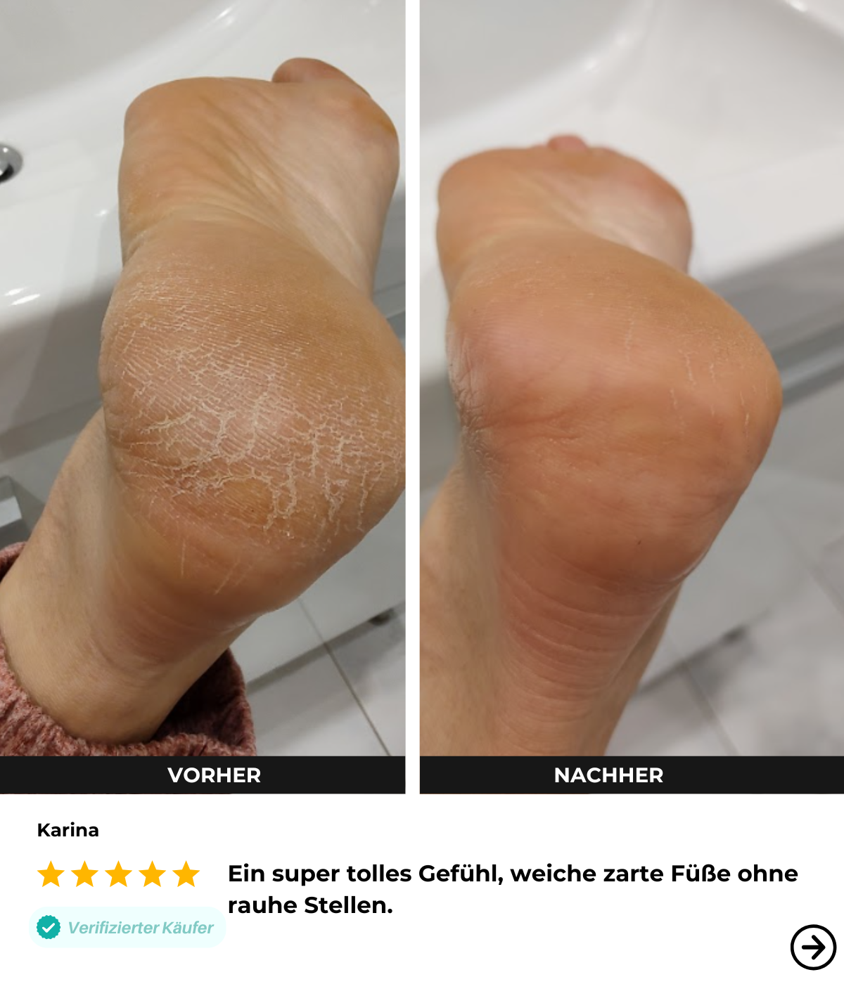 "Ich habe schon nach der dritten Anwendung gemerkt, wie die Hornhaut spürbar weniger wurde. Die Haut fühlt sich viel glatter an und sieht endlich wieder gepflegt aus."
