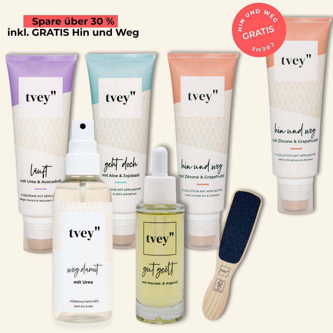 Du hast 30 Tage Zeit, das tvey Anti-Hornhaut-Set in deiner Pflegeroutine zu testen – und die sicht- und fühlbaren Ergebnisse selbst zu erleben. Wenn du nicht überzeugt bist: Geld zurück, ohne Wenn und Aber.