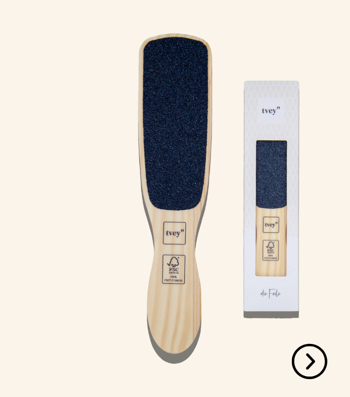 Nach der Einwirkzeit kannst du die gelöste Hornhaut mit der tvey Feile schonend abtragen. Nutze dafür zuerst die grobe, dann die feine Seite – für glatte Ergebnisse ohne Hautreizung.