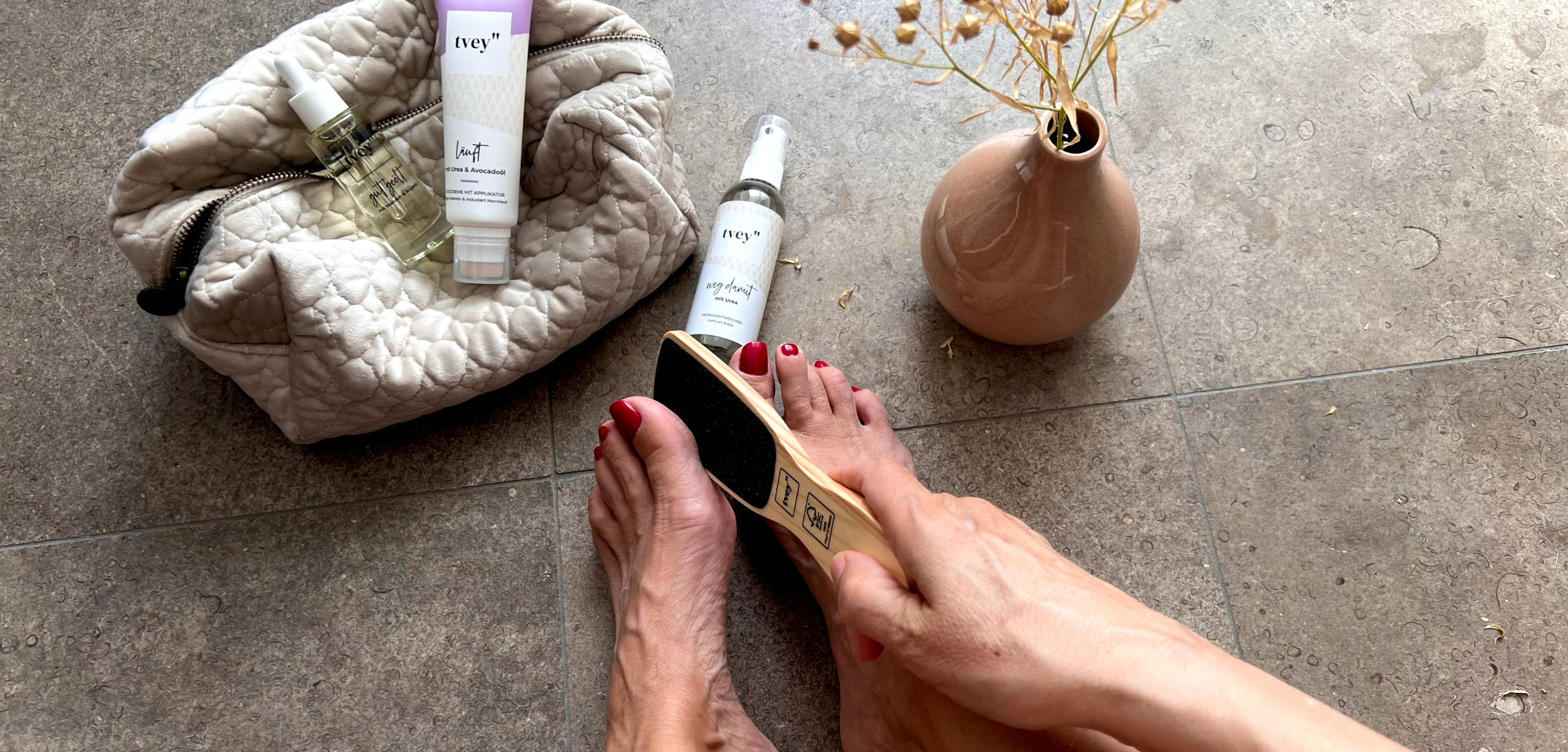 Fußpflege wurde lange übersehen – dabei tragen uns unsere Füße durchs Leben. Bei tvey glauben wir, dass sie mehr verdienen: mehr Aufmerksamkeit, mehr Wirkung, mehr Wertschätzung. Deshalb entwickeln wir evidenzbasierte Produkte, die wirklich etwas verändern – für spürbar weichere Haut und sichtbar weniger Hornhaut. Klar formuliert, wirksam in der Anwendung und reduziert auf das Wesentliche. Für eine Fußpflege, die nicht nur funktioniert, sondern sich auch gut anfühlt. Jeden Tag.